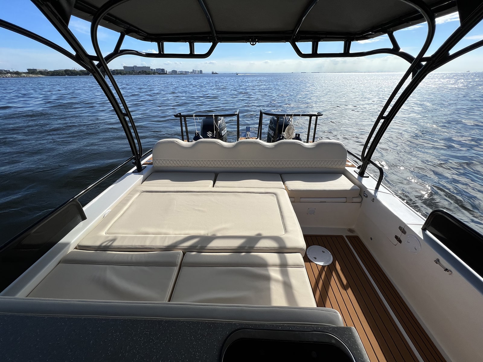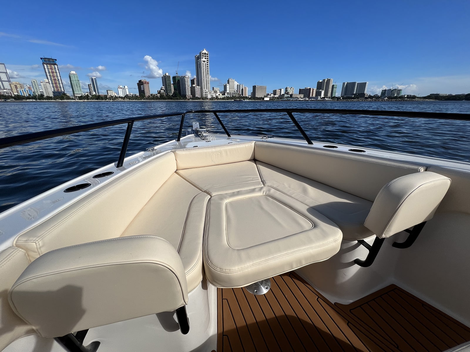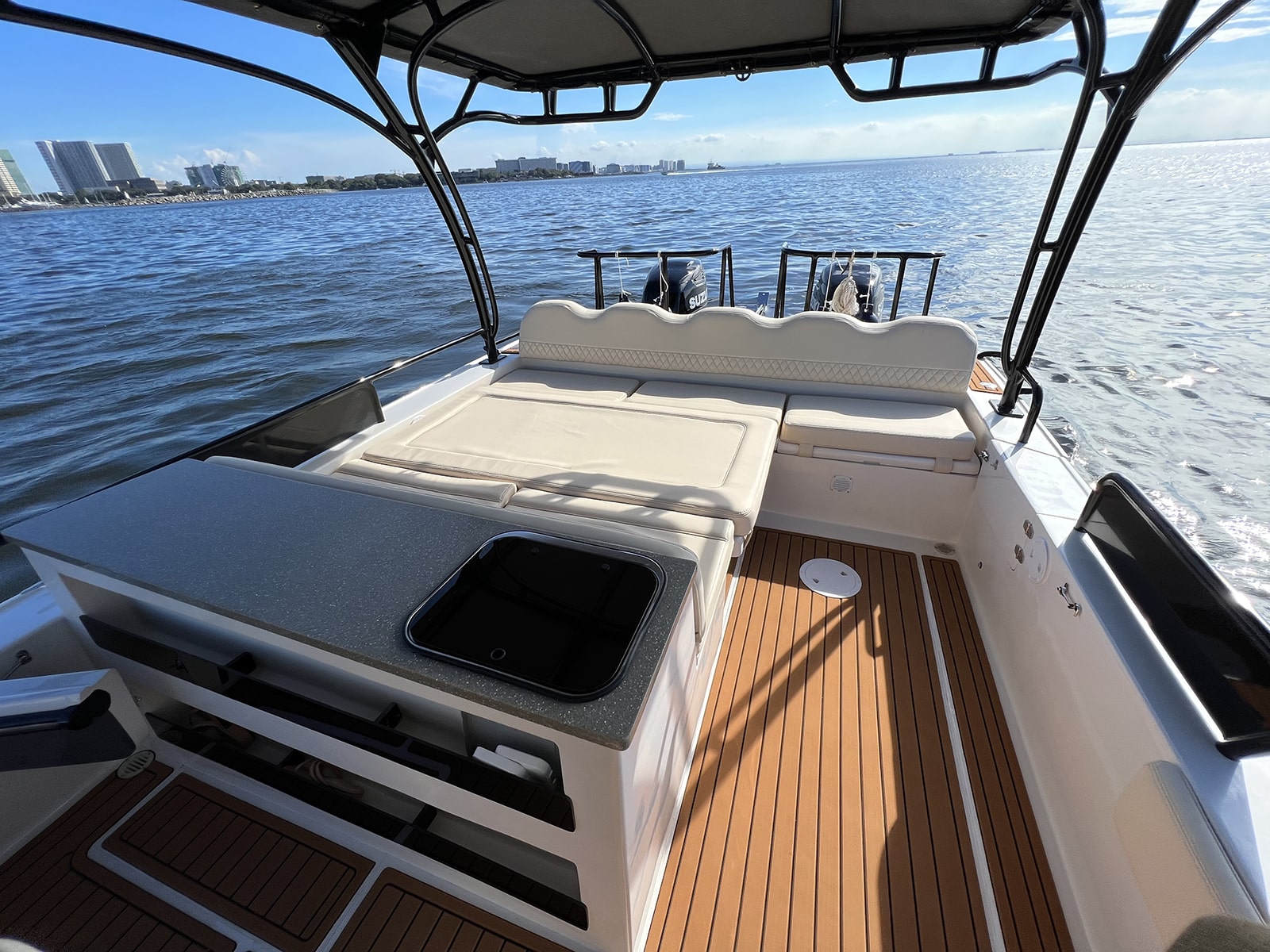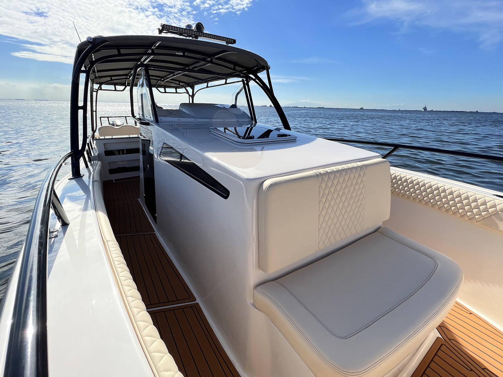 The comfort and stability one can get from this boat’s tunnel hull design and very wide beam of ten feet is unmatched by any boat of it’s class. This boat can be custom-built to your length of choice from 33 to 40 feet. With just twin 225’s this boat can reach a top speed of 48 mph and comfortably cruise at 40mph.